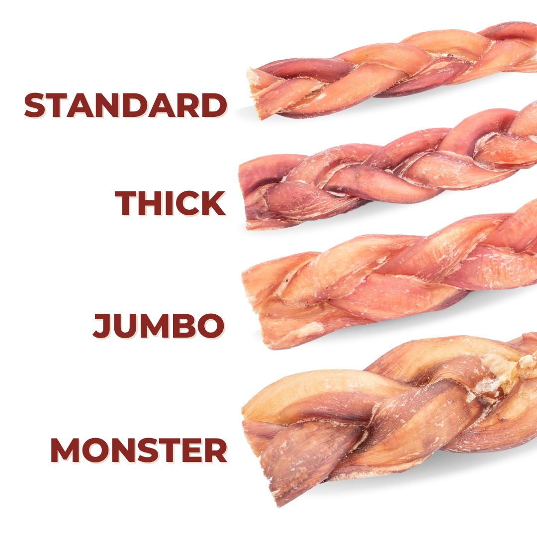We make em big! The 12 Inch Monster Braided Bully Sticks are made from three Jumbo bully sticks that are carefully intertwined. These sticks are perfect for bigger dogs and are one of the largest bully sticks available. Our bully sticks are ethically sourced and baked in an oven, making them a healthier option than rawhide. Each stick is hand-sorted and inspected to provide a reliable product with a consistently high quality and unmatched value.