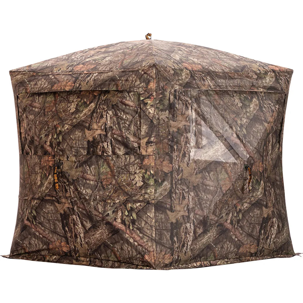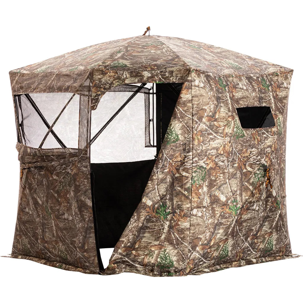 The Rhino Blind 180 Pro FD in Realtree Edge revolutionizes ground blinds with its full-door design for easy access. These blind features a comprehensive 180-degree see-through mesh system for a clear and broad view while maintaining concealment. Its large windows come with an adjustable silent slide system and two full panels of see-through mesh. Spacious enough for three, its 5-hub design ensures quick setup. The blind includes high-end stakes, measures 58? x 58? at the base, stands 70? tall, and has an 82" hub width, all in a substantial but transportable package of 17.6 lbs.